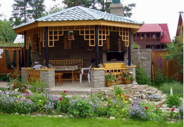 Весьма популярен пример ландшафтного дизайна, включающий большое количество построек на открытом воздухе. Такой подход, несомненно, придется по вкусу большой компании друзей. В открытую беседку можно поставить диван и стулья