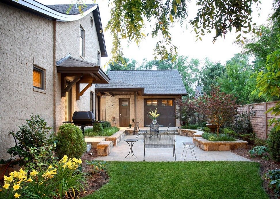Терраса или открытая веранда позволят отказаться от обширной зоны отдыха в саду. Достаточно сделать беседку или патио во дворе для небольших чаепитий, а более многолюдные компании принимать на террасе.