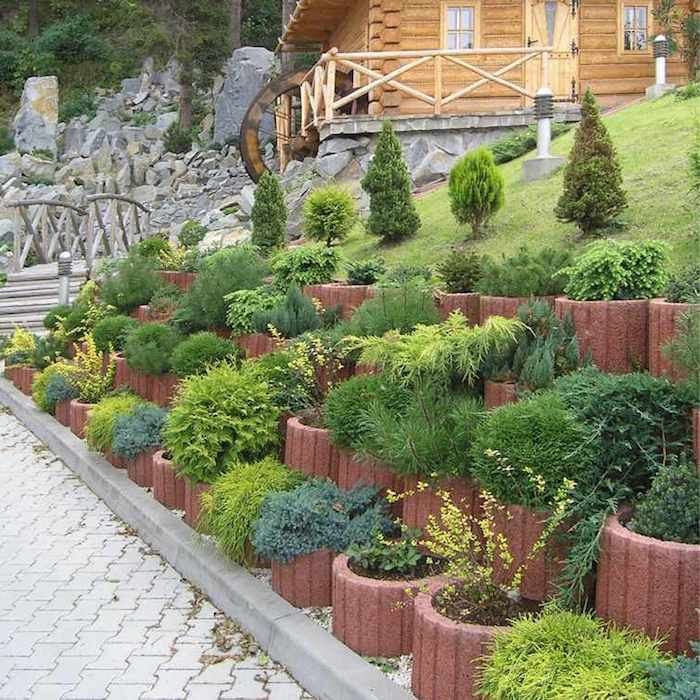 В низинах ландшафта оригинально смотрятся карликовые низкорослые растения. Отличным решением станут вечнозеленые или цветущие кустарники. На террасах можно высадить овощные культуры, деревья, декоративные кусты или разбить цветники. Низкие деревья и кусты будут эффектнее выглядеть наверху. Внизу, возле подножия холмов лучше высаживать высокие растения.