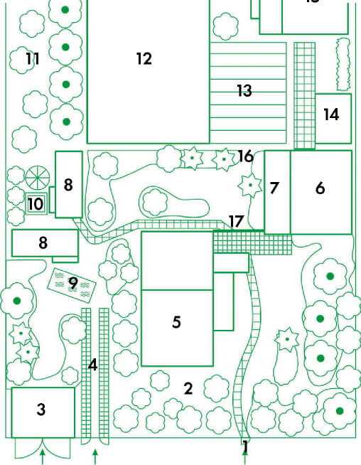 Помимо естественных элементов ландшафта на любом дачном участке присутствуют элементы архитектуры: это жилой дом, гараж, теплица, беседка. Все строения должны сочетаться между собой и складываться в единый ансамбль.
