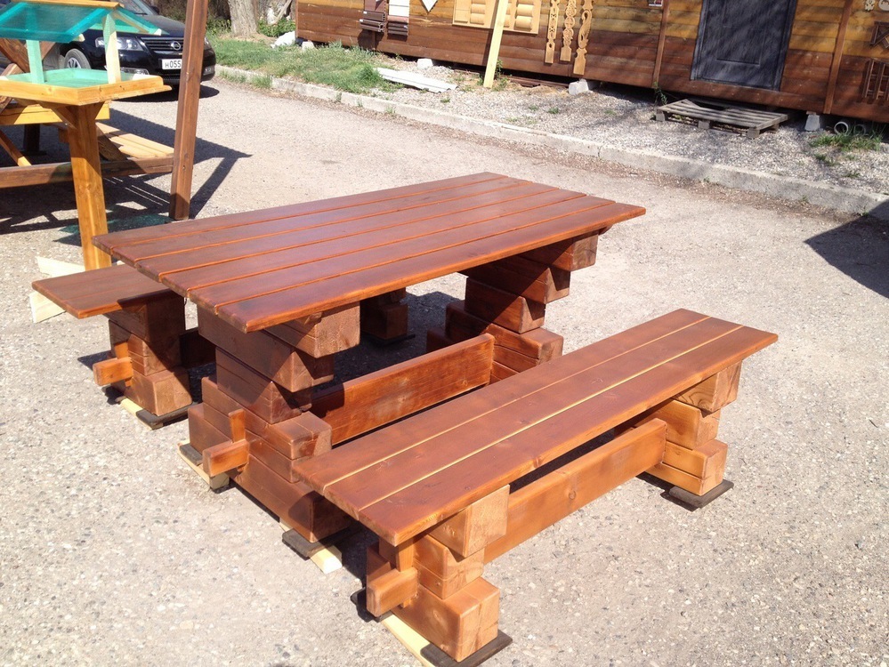 Комплект мебели можно сделать цельный и из отдельных предметов. В первом варианте скамейки со столом закреплены к общему основанию из толстого бруса. Такая конструкция не всегда удобна. Во-первых, она тяжелая, ее неудобно и сложно переносить. Во-вторых, лавки и стол нельзя использовать по отдельности, если того требует ситуация.