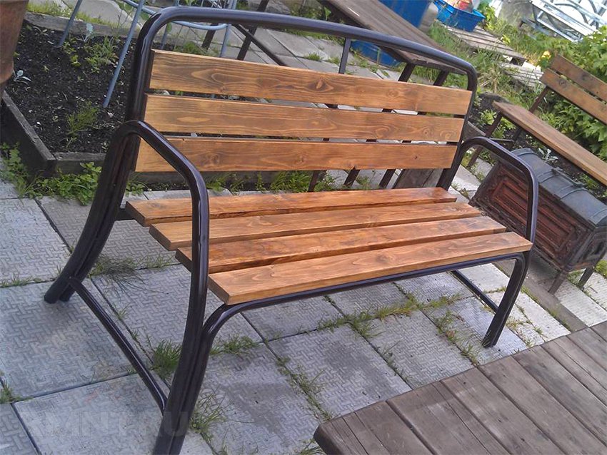 Профильная труба или другой вид проката служит крепким каркасом. А деревянные сиденье и спинка — приятный «тёплый» материал, на котором комфортно сидеть.