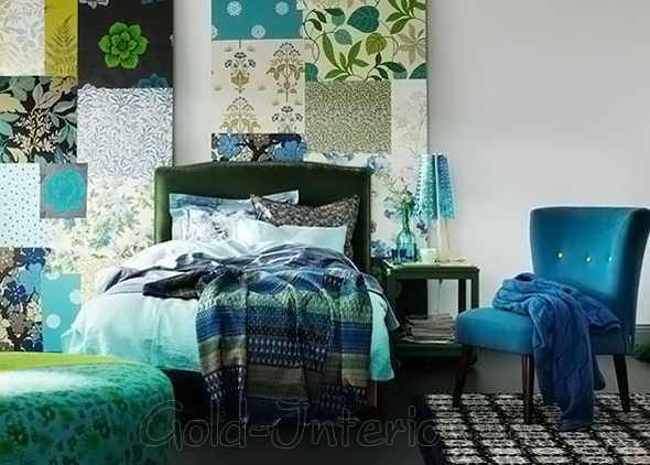 - Эта спальня похожа на гигантский коллаж, который мог бы собрать страстный любитель всех оттенков зеленого и синего. Здесь соседствуют ультрамарин, берлинская лазурь, индиго – в сочетании с болотным, оливковым и изумрудным. Композиция выглядит гармонично именно благодаря такой форме презентации – небольшими деталями, словно квадратики на лоскутном одеяле. Поэтому, если ваша жажда обладания этой палитрой так же сильна – запомните эту идею.