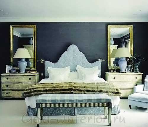 Спальни с темными стенами похожи на маленькие бархатные шкатулки, в которых семейные тайны надежно скрыты от посторонних глаз. Если вы все же хотите визуально согреть комнату, комбинируйте синий цвет в интерьере спальни с медовыми и золотистыми аксессуарами, а ниже мы рассмотрим более свежие и неоднозначные сочетания.