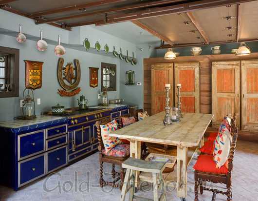 - На кухне редко получается создать строго выверенную палитру цветов – слишком много предметов всегда находится на виду, а это способно свести на нет впечатление от точного хай-тека или минимализма. Значит, обратим максимум внимания на мебель, тогда все остальное отойдет на задний план. Используем яркие персидские краски – полуночный синий, мандариновый и красный. Такое смешение характерно для эклектики, поэтому собирайте гарнитур из предметов различных стилей – и не забудьте сгладить пестроту небрежной обработкой дерева.