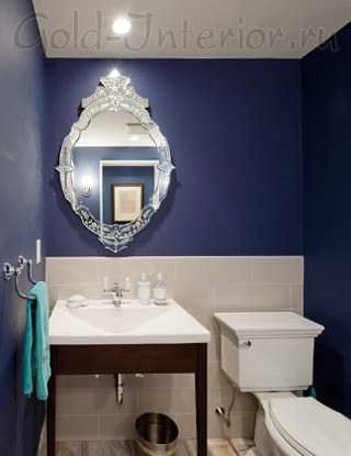 - На первом фото сапфировый синий эффектно оттеняет зеркало в серебристой раме, а также привносит в помещение игривый ритм, благодаря изящной полупрозрачной оправе. Смесь, характерная для ампира, но вызывающая симпатию по сей день.