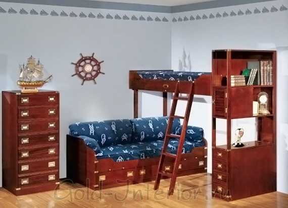 - Все дети питают любовь к тематическим интерьерам, так почему бы не оформить комнату в морском стиле? Мебель можно составить в подобие небольшой каюты и даже создать небольшой капитанский мостик!