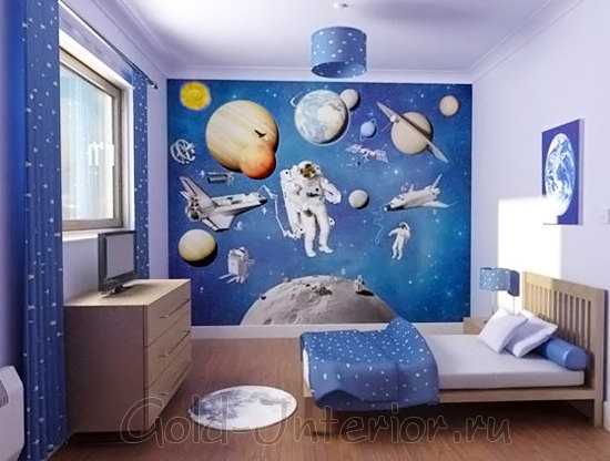 - Или развить тему космоса – какой мальчик не испытывает трепет перед непостижимо большим пространством, доступным лишь настоящим героям? Одну стену можно выделить для фотообоев с изображениями планет, астронавтов и луноходов, для постельного белья и штор выбрать ткань с изображением звездного неба, потолок же оформите картой созвездий или люстрой с подходящим абажуром, как на фото ниже.