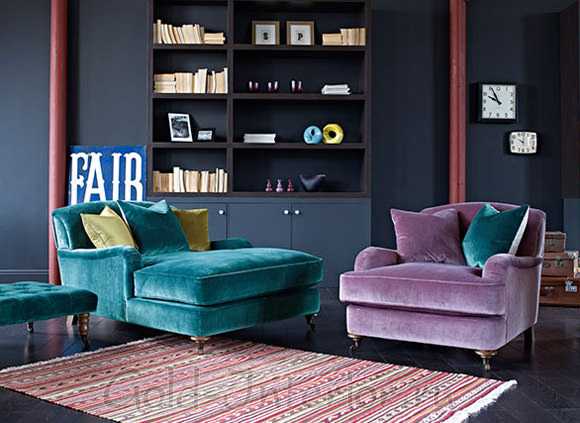 - Не столь очевидный, но столь же точный пример использования треугольника цвета. Запомните, если вы выбираете сложный синий, стальной или сапфировый, то и поддержка у них должна быть соответствующей. В этом случае в интерьер добавлен зеленый цвет медной патины и фиолетовый оттенок орхидеи. Эти цвета наиболее полно раскрываются в матовых, бархатистых материалах, поэтому для оформления выбрана простая краска и велюровый текстиль.