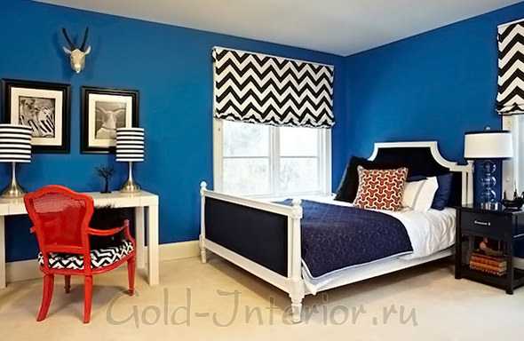 - В спальне следует избегать сочетания красного и синего на больших поверхностях. Конечно, это касается лишь чистых спектральных цветов, игра с оттенками допустима, но лучше не усердствовать и здесь. Ограничьтесь безопасным минимумом. Например, в этой комнате применен достаточно сильный контраст белого, синего и черного. Поэтому красный используется лишь в двух предметах, и все равно притягивает взгляд в первую очередь к себе.