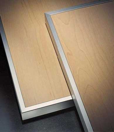 - Покрытие кромки. Чем плотнее материал покрытия кромки, тем меньше вероятность формирования сколов и трещин, и тем меньше токсических испарений попадает в воздух. Чаще всего для обработки кромки используют пленку ПВХ, но также можно выбрать алюминиевое покрытие. С его помощью вы не только сохраните внешний вид гарнитура надолго, но максимально сократите испарения, исключите травмирование.
