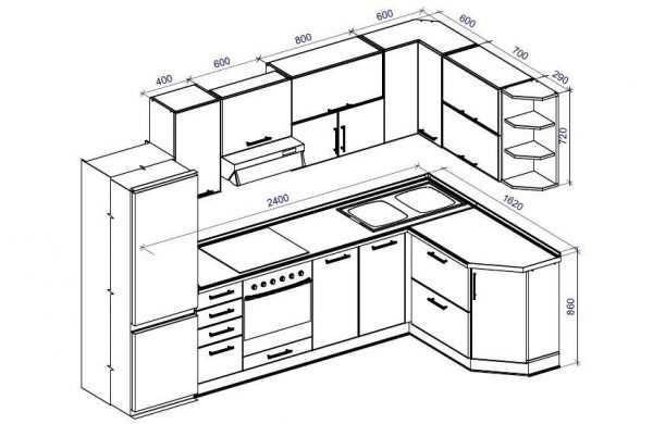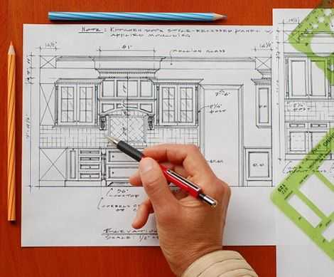 В первую очередь создают план кухни. Нужно учесть замер помещения, расположение и габариты кухонной техники, высоту и размещение гарнитура и так далее. И только определившись с этими параметрами, можно приступать к расчету размеров каждого предмета.