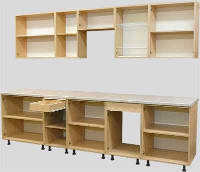 Таким же образом рассчитывают и другие напольные или навесные шкафы, учитывая назначение каждого. Так, в шкафу для мойки не нужна полка, в модели для ящиков необходимо рассчитать размеры последних с учетом направляющих, а на верхних шкафах отсутствует столешница.
