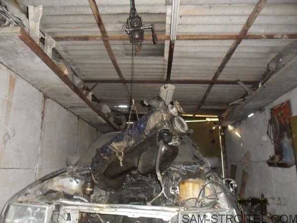 В результате получилась вот такая самодельная ручная лебёдка, с её помощью двигатель автомобиля, поднял за 20 минут.