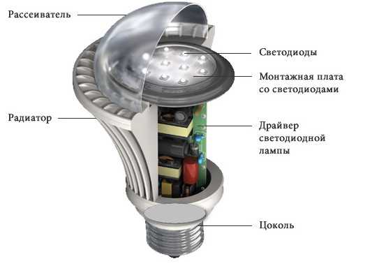 Всё конструктивное устройство светодиодной лампы включает в себя следующие элементы: