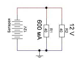 Зная законы физики, можно рассчитать, что при подключении к источнику тока с напряжением 12В потребителя с сопротивлением 40 Ом (в качестве последнего может выступать резистор), то по цепи будет протекать 0,3 А. Если же в схеме будет участвовать пара таких параллельных резисторов, то ампераж поднимется до 0,6 А.