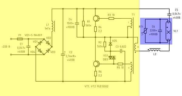 Желтым цветом выделено то, что может значительно отличаться от лампы к лампе в зависимости от производителя и ее мощности. В любом случае, оставляем эту часть безо всяких изменений. То, что отмечено синим, останется бесхозным после удаления ламп (стеклянных колб) и может быть безболезненно удалено с платы, дабы не мешало.
