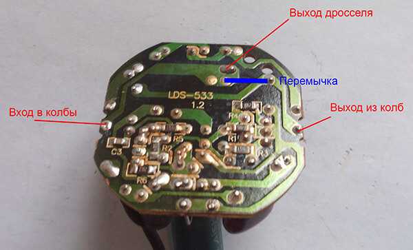 Как видно, нужно закоротить выход дросселя (он же вход в колбы) с выходом из колб по кратчайшему пути. Электроника вашей лампы, скорее всего, внешне будет отличаться от того, что вы видите на картинке. Важно понять сам принцип.