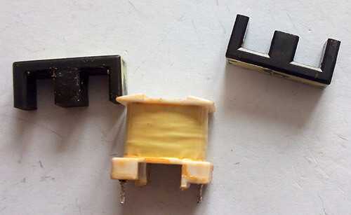 Аккуратно выпаиваем дроссель. Дальше очень творческая задача – его разобрать. Дроссель состоит из катушки с проводом, в которую сверху и снизу вставляются две половинки Е-образного феррита. Разобрать дроссель – это значит разъединить спаявшиеся за года половинки тонкого и хрупкого феррита (которые еще иногда заливают лаком), снять их и получить свободный доступ к катушке с проводом. Удалите ленту, которая расположена по периметру феррита, после чего нежно и не прикладывая больших усилий, попробуйте его разъединить. Помогает нагревание – например, аккуратно паяльником по всему периметру феррита. У меня получилось, правда, далеко не сразу.