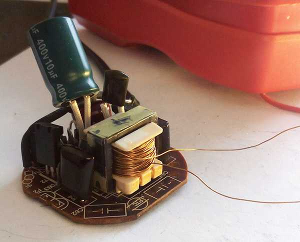 Подключаем входное сетевое напряжение. Взрывов, фейерверков нет? Чудесно! Теперь аккуратно меряем переменное напряжение на выходах вторичной обмотки. Получилось то, что нужно? Здорово! Если нет, отключаемся от сети и отматываем (чтобы уменьшить) или добавляем (чтобы увеличить) несколько витков в обмотке. Разбирать дроссель для этого не нужно – просто аккуратно продевайте провод между катушкой и ферритом.