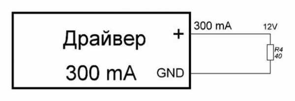 Драйвер для светодиода работает на поддержание стабильной силы тока. Значение напряжения в таком случае способно варьироваться. При подключении к нему во время выдачи 0,3 А резистора на 40 Ом, потребитель будет питаться напряжением в 12 В. Если же добавить параллельно второй резистор, то напряжение упадет до 6 В, а сила тока останется 0,3А.