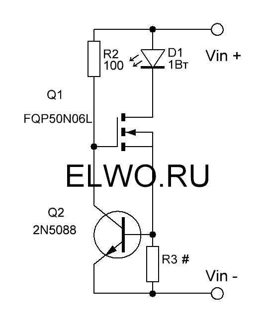 В данном случае установлен ток 225 мА с помощью R3 на 2,2 Ом. R3 имеет мощность 0,1 Вт, таким образом, стандартный 0,25 Вт резистор подходит отлично. Транзистор Q1 будет работать до 18 В. Если вы хотите больше, нужно изменить модель. Без радиаторов, FQP50N06L может рассеивать только около 0,5 Вт — этого достаточно для 200 мА тока при 3-х вольтовой разнице между источником питания и светодиодом.