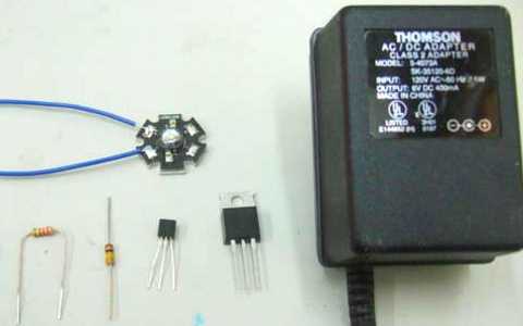В качестве источника питания использован трансформатор-адаптер, вы можете использовать батареи. Для питания одного светодиода 4 — 6 вольт достаточно. Вот почему эта схема удобна, что вы можете использовать широкий спектр источников питания, и он всегда будет светить одинаково. Радиатор не требуется, так как идёт около 200 мА тока. Если планируется больше тока, вы должны установить LED элемент и транзистор Q1 на радиатор.