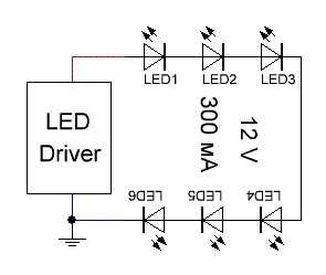 Первый способ – это последовательное введение. Здесь потребуется драйвер напряжением 12В и током 300мА. При таком способе светодиоды в лампе или на ленте горят одинаково ярко, но если вы решитесь подключить большее число светодиодов, вам потребуется драйвер с очень большим напряжением.