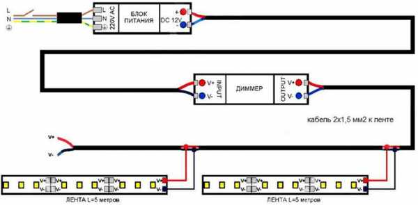 - Блок питания (для преобразования тока) и диммер (для плавного регулирования яркости освещения).