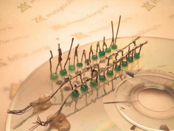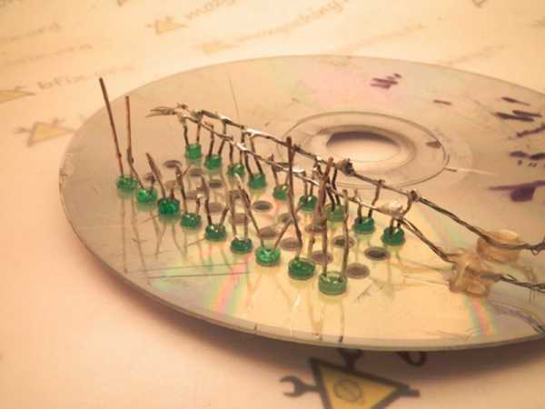 - в проделанные отверстия вставляем светодиоды и соединяем их между собой по выбранной схеме.