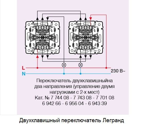 Самыми популярными моделями этого вида устройства являются серии legrand etika и valena. Ниже можно рассмотреть схему подключения двухклавишного проходного выключателя.
