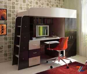 В подкроватной нише обычно стоит компьютерный стол и стул. Лестница, ведущая на кровать-чердак, исполнена ящиками, поставленными друг на друга. Довольно вместительные тумбы позволят в своих недрах поместить белье и разные мелочи.