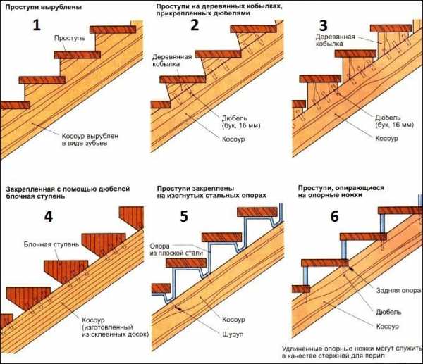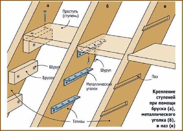 К косоуру ступени прикручивают саморезами. В случае с тетивами, помимо пазового, используют и другие способы крепления: