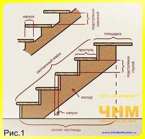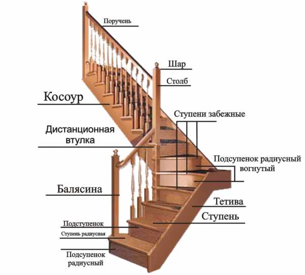 Устройство деревянной лестницыКонструкция лестничного марша представляет собой комбинацию из различных составляющих с разным функциональным назначением: