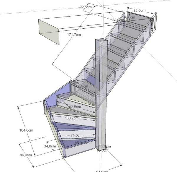 Между маршами монтируется площадка или ставятся поворотные ступеньки. Если не получается выполнить расчет самостоятельно, можно воспользоваться специальной программой, представленной чуть ниже, где наглядно будет отражаться локализация лестничных деталей.