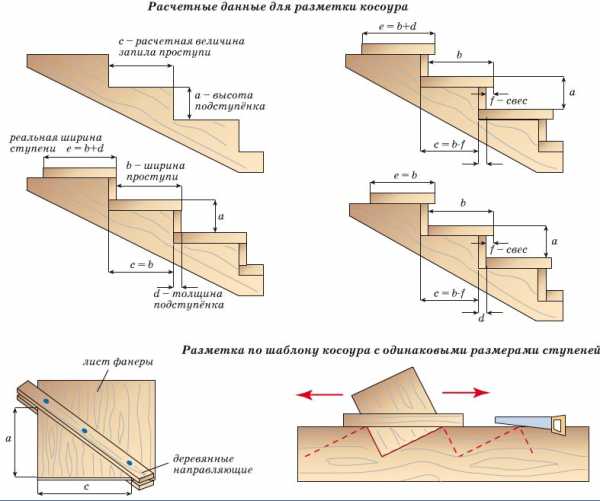 На приготовленных досках нужно отметить длину и отпилить лишнее. На бруске с помощью угольника размечают высоту подстепенка и ширину проступи с убавкой 2-4 см.