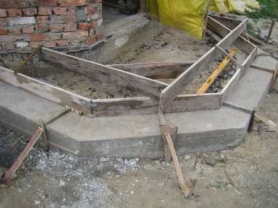 - Начало бетонирования крыльца производится из лотка. Укладка начинается с нижней ступеньки, обеспечивая движение вверх. Фиксация опалубки специальными подпорками предотвращает риск деформации. Размещение монолитной смеси должно обеспечиться выдержкой на протяжении 2 недель, вслед за чем, опалубку снимают.