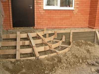 Если необходимо понять, как сделать лестницу для крыльца самостоятельно, то можно начать с обустройства опалубки. Она создается с использованием досок слоем по 2 см и по 20 см в длину. Расставляются по углами основы клинья. Натягиваются на них бечевку. Соблюдая шаг в 100 см, вбиваются аналогичные клинья по всему периметру. Доски прибиваются к брусьям с внутренней стороны, длина гвоздей должна позволять образовывать загиб книзу. К клиньям, при образовании высоты основы более 20 см, монтируется распорка или упор.