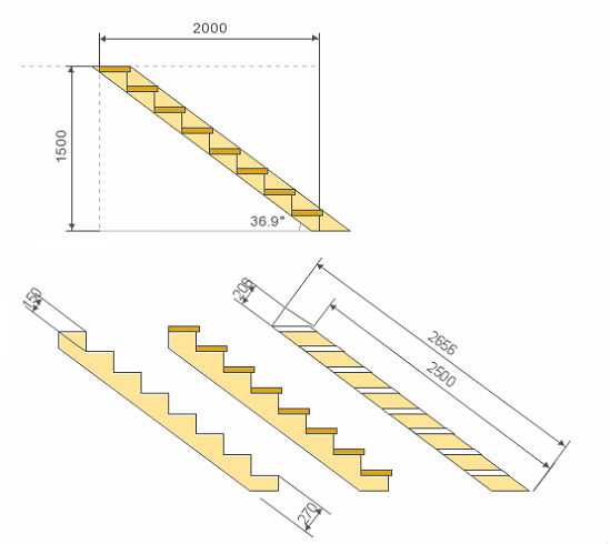 Допустим, требуется построить лестницу высотой 1500 мм, есть свободный участок перед домом 2000 мм, таким образом, по теореме Пифагора можно высчитать длину прямого косоура: