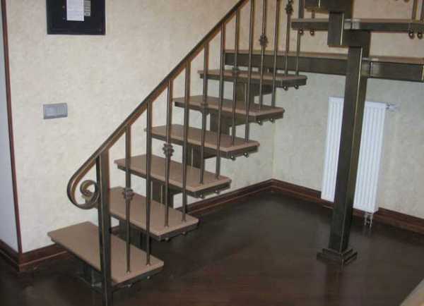 Конструкция из металлического профиля может состоять из тетивы (двух несущих балок с закрепленными между ними ступенями, она может сооружаться с применением одного или двух косоуров). Это зависит от предпочтений хозяев дома. Центральный ломанный косоур изготавливается из отдельных деталей методом сварки. Два отрезка металлического профиля свариваются под прямым углом.