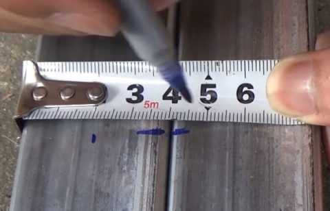 Для создания приставной конструкции необходимо сделать заготовку ступенек. Профиль, длина которого равна 165 см, разрезается на 5 одинаковых изделий длиной 33 см. Делается разметка на двух профилях длиной 2 м. Ставятся отметки так, чтобы между ними был промежуток по 35 см.