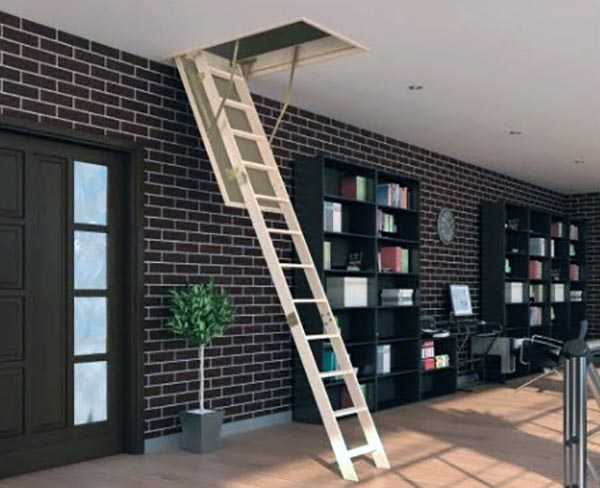 Если подниматься наверх приходится нечасто, лучше установить в загородном доме конструкцию раскладного типа. Она отлично подходит для мансарды. Ее преимуществом является возможность складывания при необходимости. Малогабаритные выдвижные модели прикрепляют к люку на потолке. Можно легко откинуть конструкцию, а затем задвинуть ее обратно. Для обслуживания чердака раскладная конструкция – идеальный вариант.