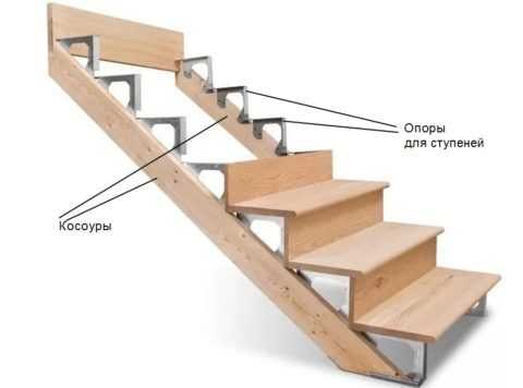 - С помощью косоуров. Косоуры – это один из видов направляющих опор, на которые устанавливаются ступени.