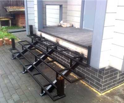 - Металл. Изготовить металлическую лестницу для террасы самостоятельно под силу единицам. Наличие сварочного аппарата – далеко не единственное условие. Гораздо практичней заказать готовую конструкцию.