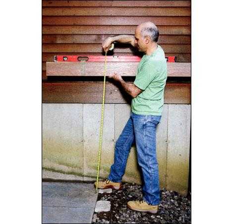 Лестница для крыльца обычно выполняется с уклоном 45 градусов. По этой причине основания для нее должны быть выполнены на определенном расстоянии от края настила. Чтобы определить точки установки опор, следует приложить к террасе рейку, которая будет имитировать положение лестницы.