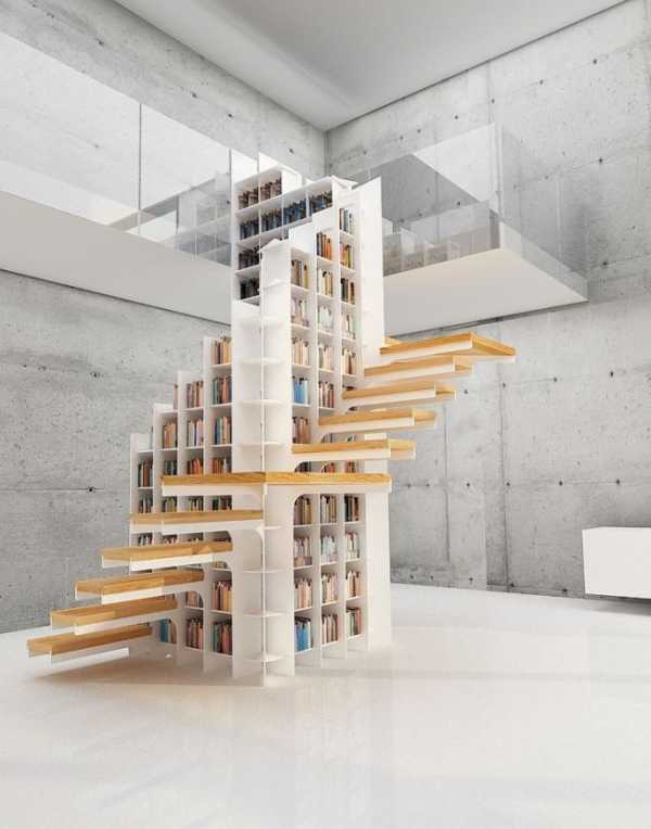 Внутри лестничных маршей расположен большой стеллаж с книгами – функционально и необычно