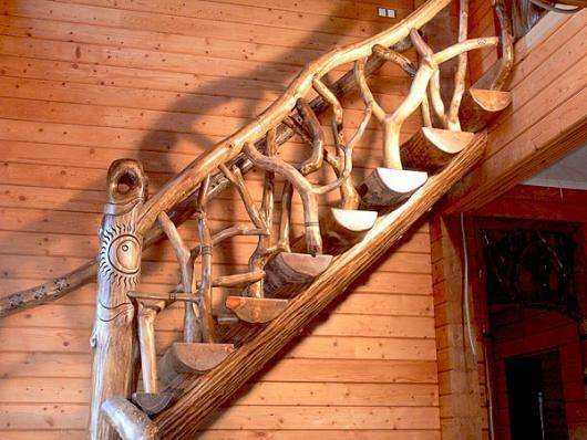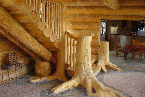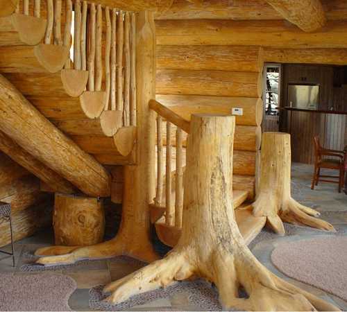 Такое украшение интерьера – удовольствие не из дешевых, особенно если использовать ценные сорта древесины и оригинальный дизайн. При возведении дома из сруба часто остаются обрезки и остатки бревен достаточной длины, из которых могут получиться отличные ступени, опорные столбики и даже косоуры.