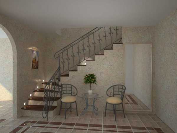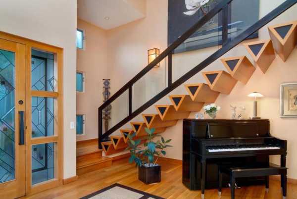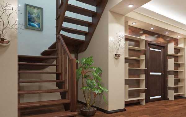 - Прихожая должна быть удобной, а потому и лестница в ней обязана отличаться функциональностью: под лестничным пространством можно разместить кладовую, а само пространство оформить полками или встроенными нишами из гипсокартона.
