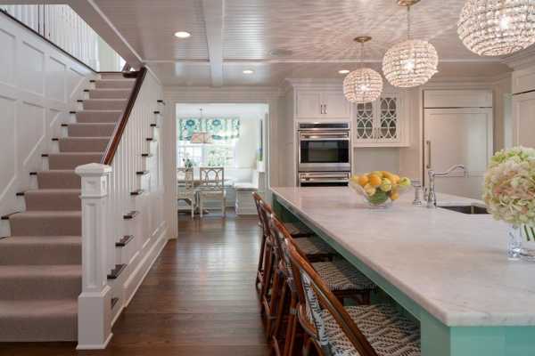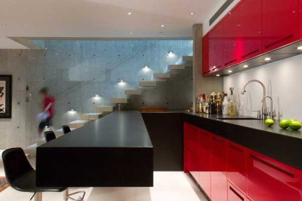 - На кухне лучше размещать лестницу из натуральных материалов. При этом, для опорных элементов конструкции следует выбирать твердые массивы дерева (бук, ясень, дуб), а для перил подойдут и мягкие (например, сосна). Интересным вариантом станет лестница с перилами из бамбука.