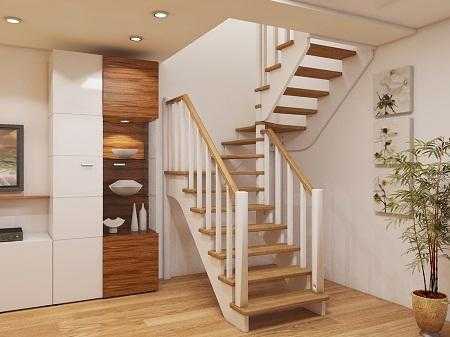 - Для небольшого коридора подойдет угловая лестница на косоурах, конструкция типа «гусиный шаг». Главное, чтобы цвет лестницы совпадал с цветовой гаммой коридора, а материалы для отделки – с материалом дверных, зеркальных рам, мебели и т.д.